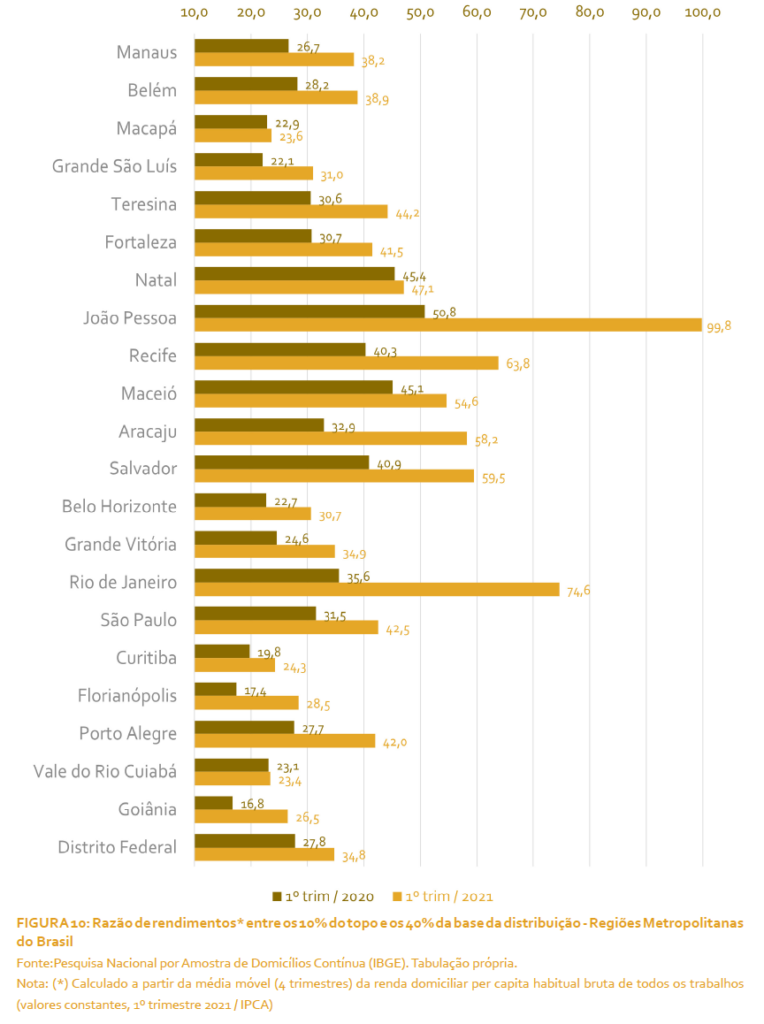 Os dados mostram que no primeiro trimestre de 2021 a média móvel do coeficiente de Gini nas Regiões Metropolitanas, que mede a desigualdade de rendimentos do trabalho (quanto mais alto o valor, maior a desigualdade), atingiu seu maior valor na série histórica, iniciada em 2012, chegando a 0,637. Isso significa que o nível de desigualdade da renda do trabalho foi o mais elevado em todo o período observado. Um ano atrás, no primeiro trimestre de 2020, antes de sermos atingidos pela crise da Covid-19, essa média do Gini era de 0,608.